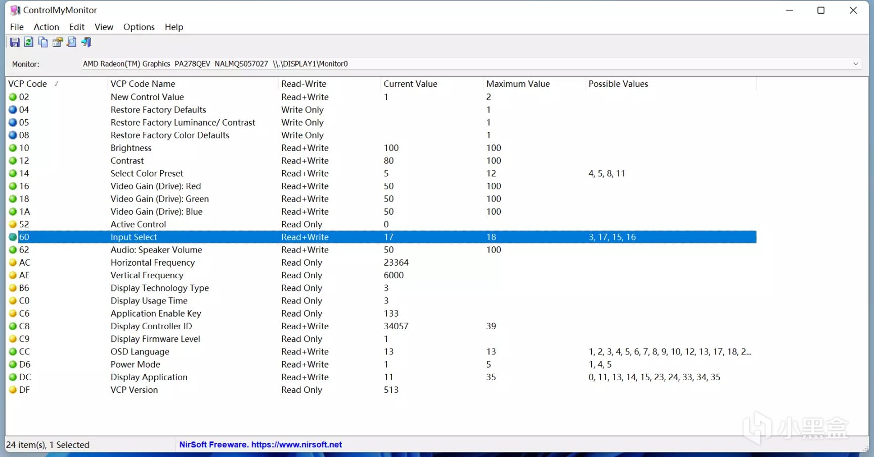 在软件窗口可以看到显示器可控的方法和值。注意图中高亮部分,Input Select意为输入源,其中Current Value为当前输入口的值,Possible Values一列显示的是可用的值。