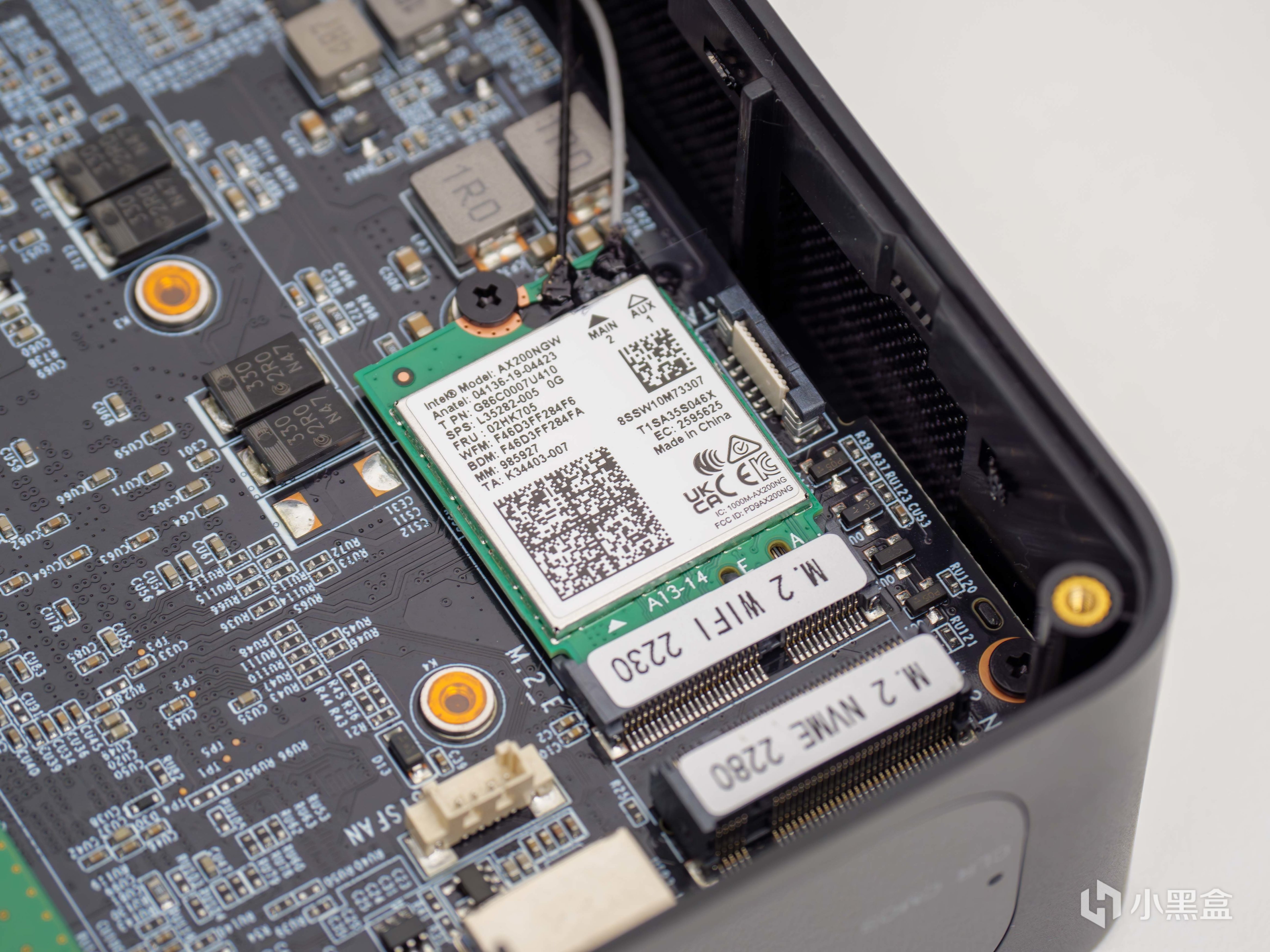 而这台迷你主机的无线网卡则隐藏在了SSD的下方,使用的是intel的AX200网卡,支持WiFi6协议2x2 mu-mimo,在160MHz下最高可以实现2402Mbps的WiFi连接速度,也是目前最主流的WiFi6网卡之一。
