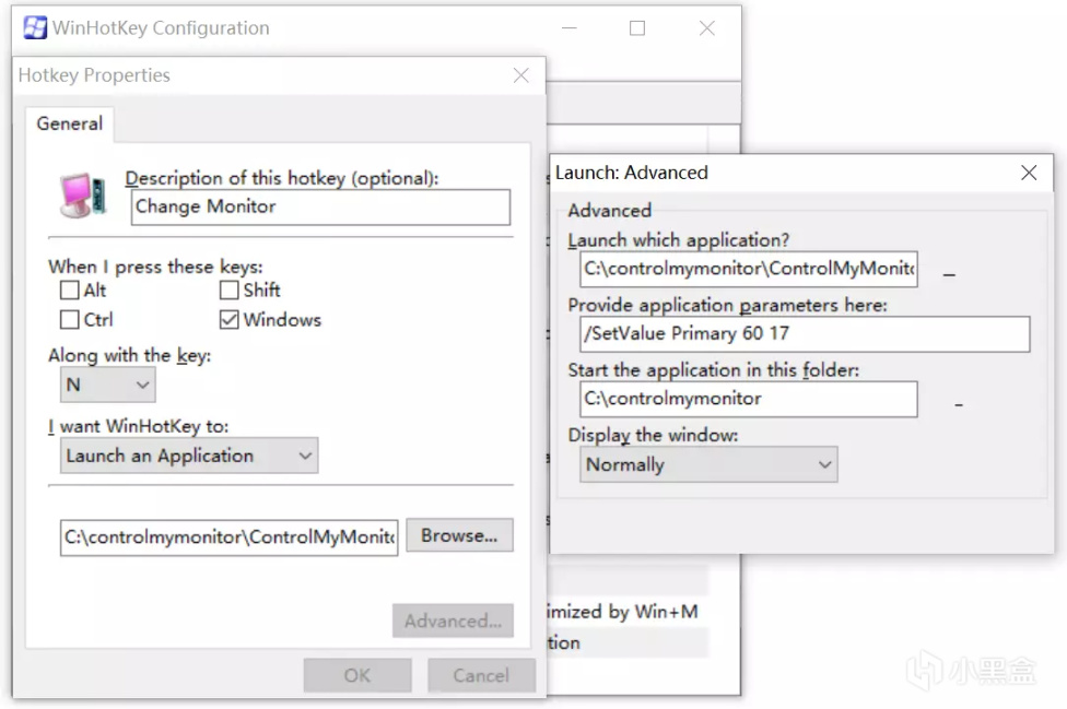 由于ControlMyMonitor支持命令操作的方式,所以我们的思路是安装WinHotKey后,自己随便设定1套快捷键运行ControlMyMonitor.exe这个可执行程序,并在高级设定中增加命令行参数 /SetValue Primary 60 15。这样设定完成后,使用快捷键即可切换输入源为DP接口。