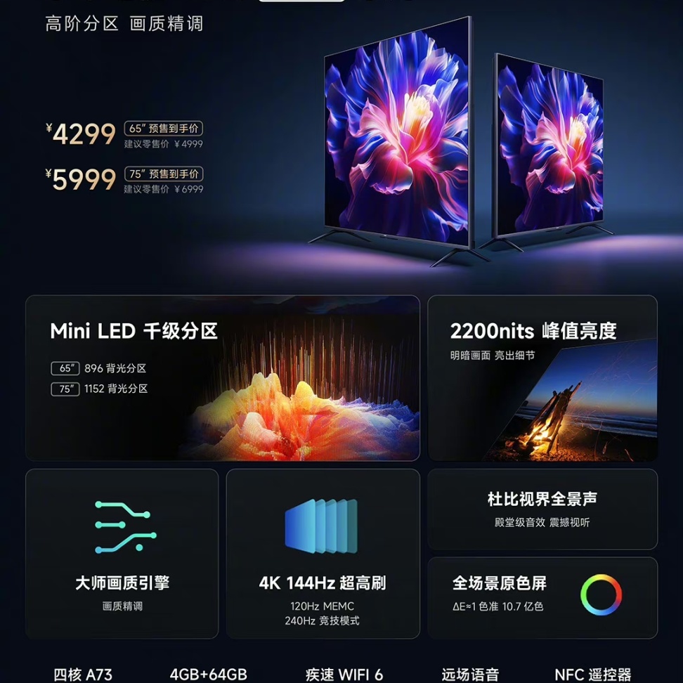 此次电视新品有65英寸和75英寸两个版本,小米电视 S Pro 65和75英寸版本均配备一块4K 144Hz刷新率的Mini LED面板(拥有896、1152分区背光),峰值亮度2200nit,支持10.7亿色、ΔE≈1、杜比视界/全景声。