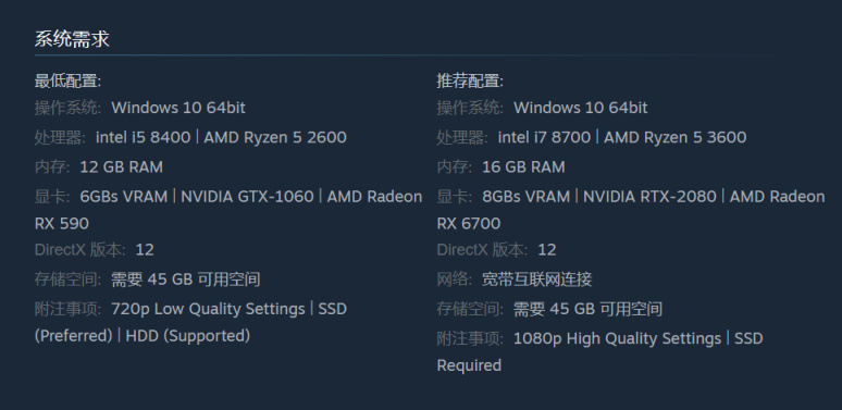 此外,《墮落之主》的Steam頁面列出了官方的顯卡最低和推薦配置要求。最低要求爲GTX 1060,而推薦配置爲RTX 2080。具體的配置需求如下: