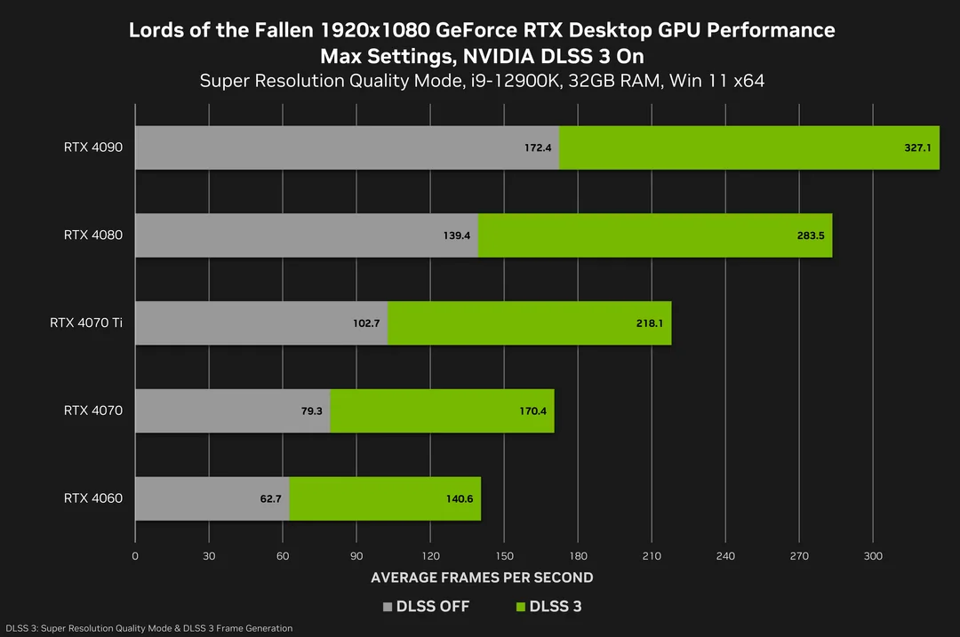 虛幻5引擎的力作《墮落之主》已確認將在首發時支持DLSS 3 和 FSR 3.0。英偉達官網公佈了《墮落之主》在40系顯卡下的性能表現,尤其突顯了關閉和開啓DLSS 3對幀率的顯著影響。以下是關鍵信息:
