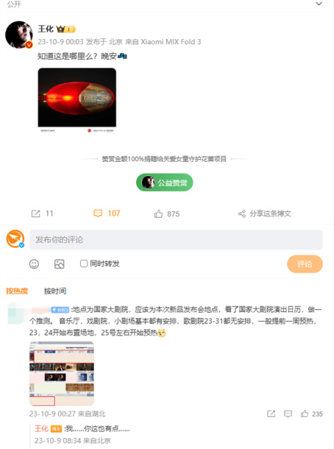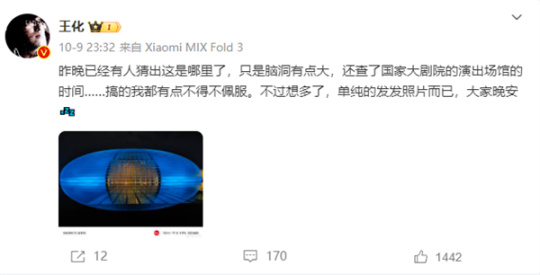 值得一提的是,小米集團公關部總經理王化前不久在微博曬出國家大劇院的照片,有很多網友猜測這會不會是小米14系列發佈會地點,甚至還有人找出國家大劇院演出日曆,詳細分析了發佈會預熱甚至佈置場地的時間。