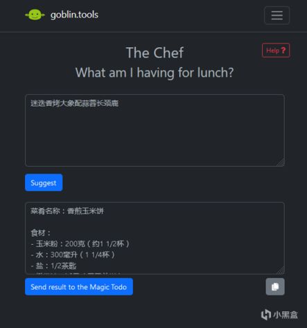 AI厨子,不知道靠谱不靠谱。你可以在文本框中输入想要放进锅里的食材,这个工具会用AI生成看上去有模有样的菜谱,笔者没有尝试过照着给出的建议做饭,但看上去每次生成的内容比较靠谱。甚至当你胡乱输入像“迷迭香烤大象配蒜蓉长颈鹿”这种一眼不正经的内容时,它也会提供给你一道看上去有模有样的正常菜谱。(笑)