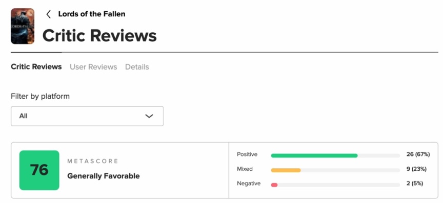 2、類魂遊戲《墮落之主》的媒體評測於今晚正式解禁後,M站的均分已經漲到了76分。據瞭解,目前共37家評測,26家給出好評,9家中評,2家差評。很多媒體都在稱讚其在玩法上的創新,其中GamingBolt給出了80分的高分評價。PC Games也給這款遊戲打出了80分,並表示,《墮落之主》的重啓並沒有徹底改變這一類型,但它是一款製作精良的類魂遊戲。TheGamer則給出了70分,並表示,《墮落之主》的遊戲世界不同於我們所見過的任何東西,提供了一個獨特的類魂類型。