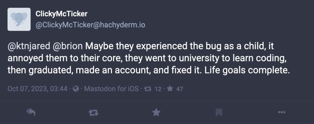 在社交媒体上,特别是你可能期望在Mastodon实例上找到对Mozilla的XML用户界面语言有意见的人,都为此欢呼。有些人表达了他们对Bugzilla(一个追踪bug的工具)比这个bug自身存在还要久(截至8月份已经有25年)的惊讶。一些人提出,这个修复对抗了“stalebots”(一种标记旧的、未解决问题以便删除的机器人)的盛行。还有人为此编排了一整个英雄之旅的故事: