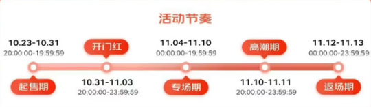 京东2023年“双11”活动的时间点,整体将围绕“起售期、开门红、专场期、高潮期、返场期”五个时期,各时期具体活动时间如下: