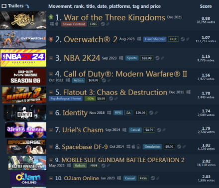 去年一年,《三國殺》一直穩坐Steam差評的頭把交椅,結果今年殺出的《守望先鋒2》和《NBA 2K24》讓玩家們措手不及,一度跌至第三名。爲此,不甘示弱的玩家們發起了“匡扶漢室”的運動,瘋狂給《三國殺》刷差評,最終得以“還於舊都”。
