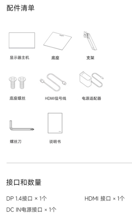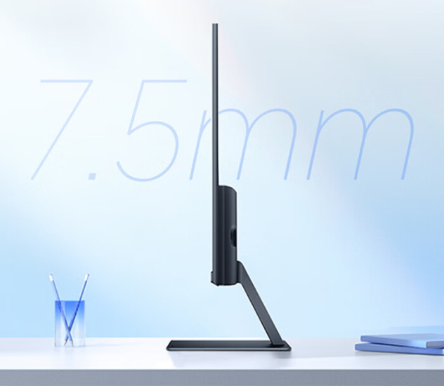 该显示器采用三微边设计,屏占比达 90%,机身厚度最薄处为 7.5mm,支架可俯仰调节,配有 DP 1.4 和 HDMI 接口,支持壁挂。