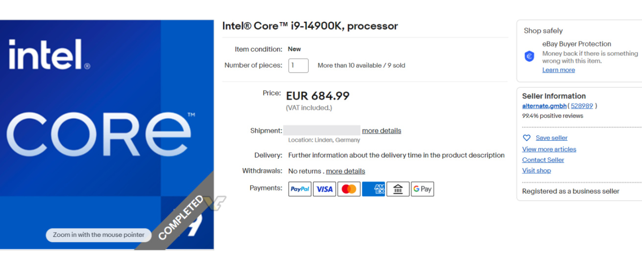 与此同时,在德国,英特尔的酷睿 i9-14900K 在 eBay 上的售价为 684.99 欧元,目前已被下架,CPU 价格仅比 i9-13900K 高出 3%