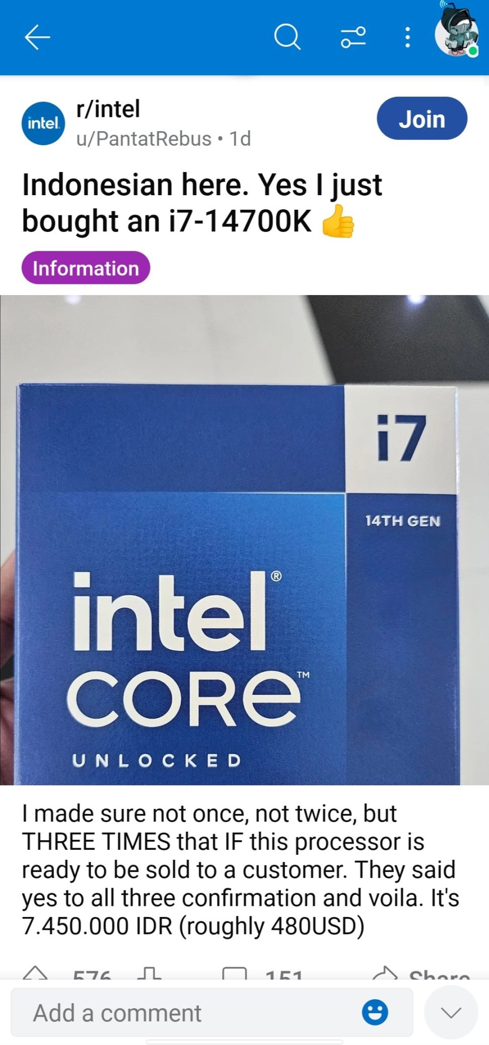 国外一用户从一家印尼零售商手中购买了英特尔尚未发布的第 14 代酷睿 i7-14700K CPU并在红迪上晒出了图片。