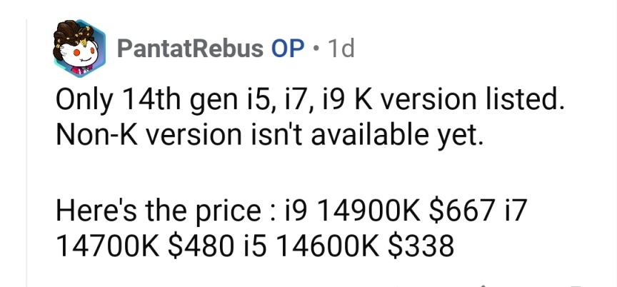 关于定价,该用户透露,他以 480 美元左右的价格购买了英特尔酷睿 i7-14700K,这比酷睿 i7-13700K 的 RCP 高出 15%。