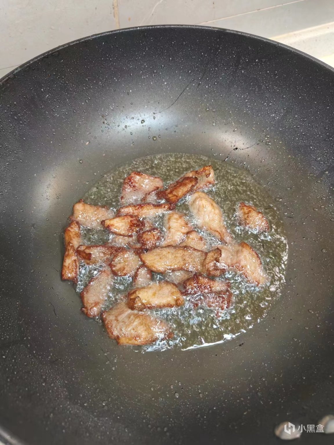拿出昨晚沒有洗乾淨的鍋子,起鍋燒油,油可以多一點,等到油溫到三五層樓那麼高的時候, 倒入醃好的肉,迅速的翻炒,翻炒到一集奧特曼的時間,肉變得金黃乾焦即可出鍋