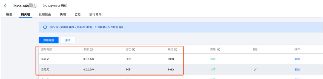并且,如果服务器本身开启了防火墙,需要将9993端口进行放行;同时,服务器安全组也需要放行9993端口,比如我的腾讯云轻量云服务器安全组设置截图: