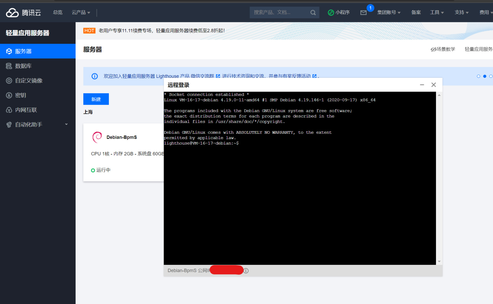 买完服务器之后,腾讯会让你先重置密码,然后你进入腾讯的服务器-轻量服务器-控制台,就可以看到自己的主机了。其中是默认绑定了一个公网IP地址,相当于你花两百多买了三年的公网IP。