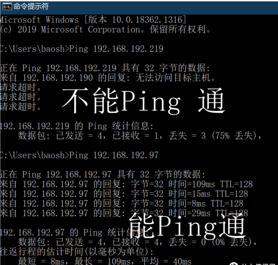 因此,建议在拿到两个设备的“家庭内网”IP地址之后,先在CMD命令行窗口Ping一下地址,看能不能Ping通,如果能Ping通的话就走下一步RDP连接部分,如果不能Ping通的话,建议看看后面我是怎么解决的: