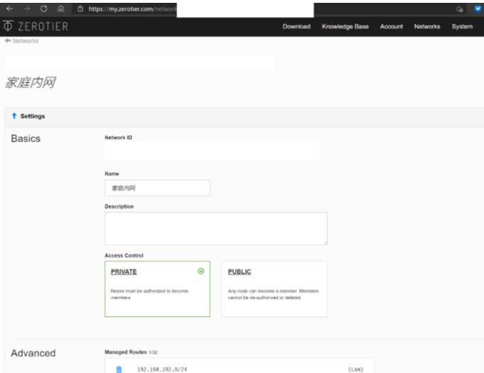 创建网络:创建一个新的网络之后,我们得到一个 Network ID,这个在后面的设备连接时需要用到,点击刚刚创建的网络我们可以设置更多选项。默认的设置就可以用了,右边 IPv4 的设置就是分配设备内网 IP 网段,其他的设置可以在 Setting help 里看到说明,不了解的不建议乱设置,如果不小心把自己的网络暴露在外部,会相当危险。