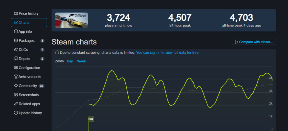 根据SteamDB的数据,《极限竞速:Motorsport》在四天前发售,但首发同时在线人数仅为4703人,当前在线人数为3724人。与之相比,《红霞岛》的Steam在线同时在线人数超过6万。