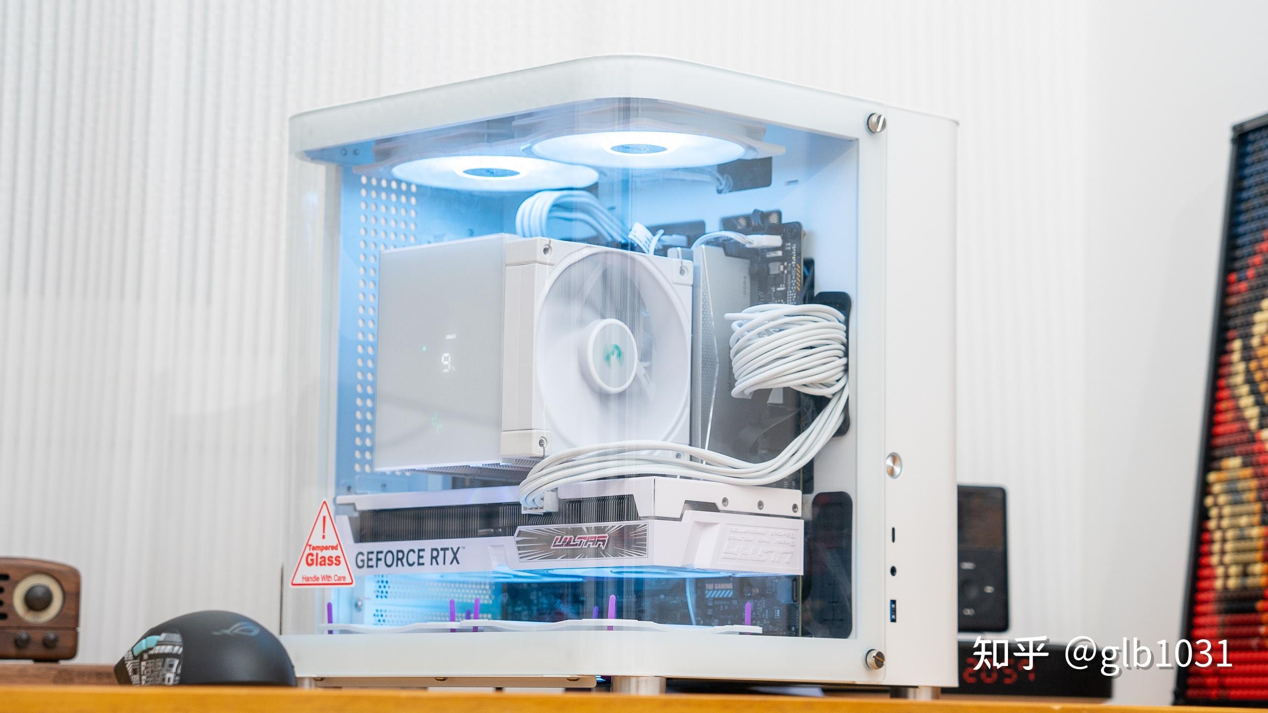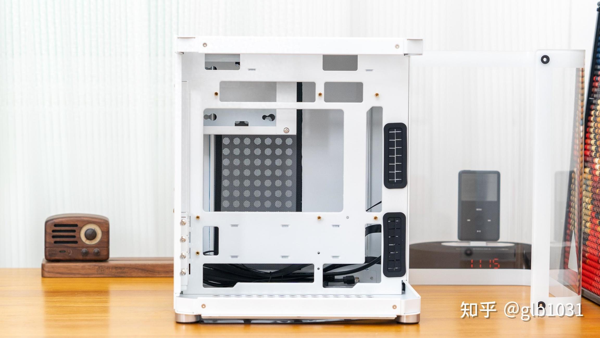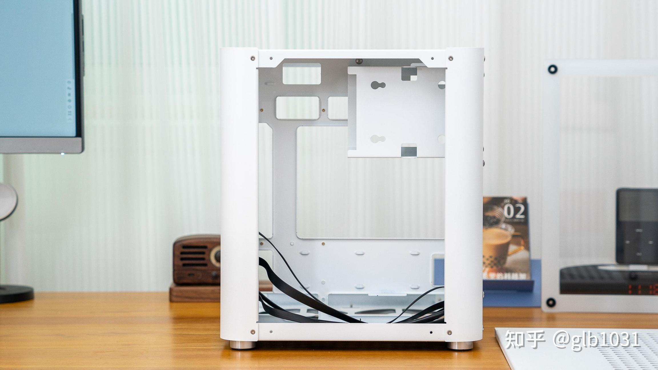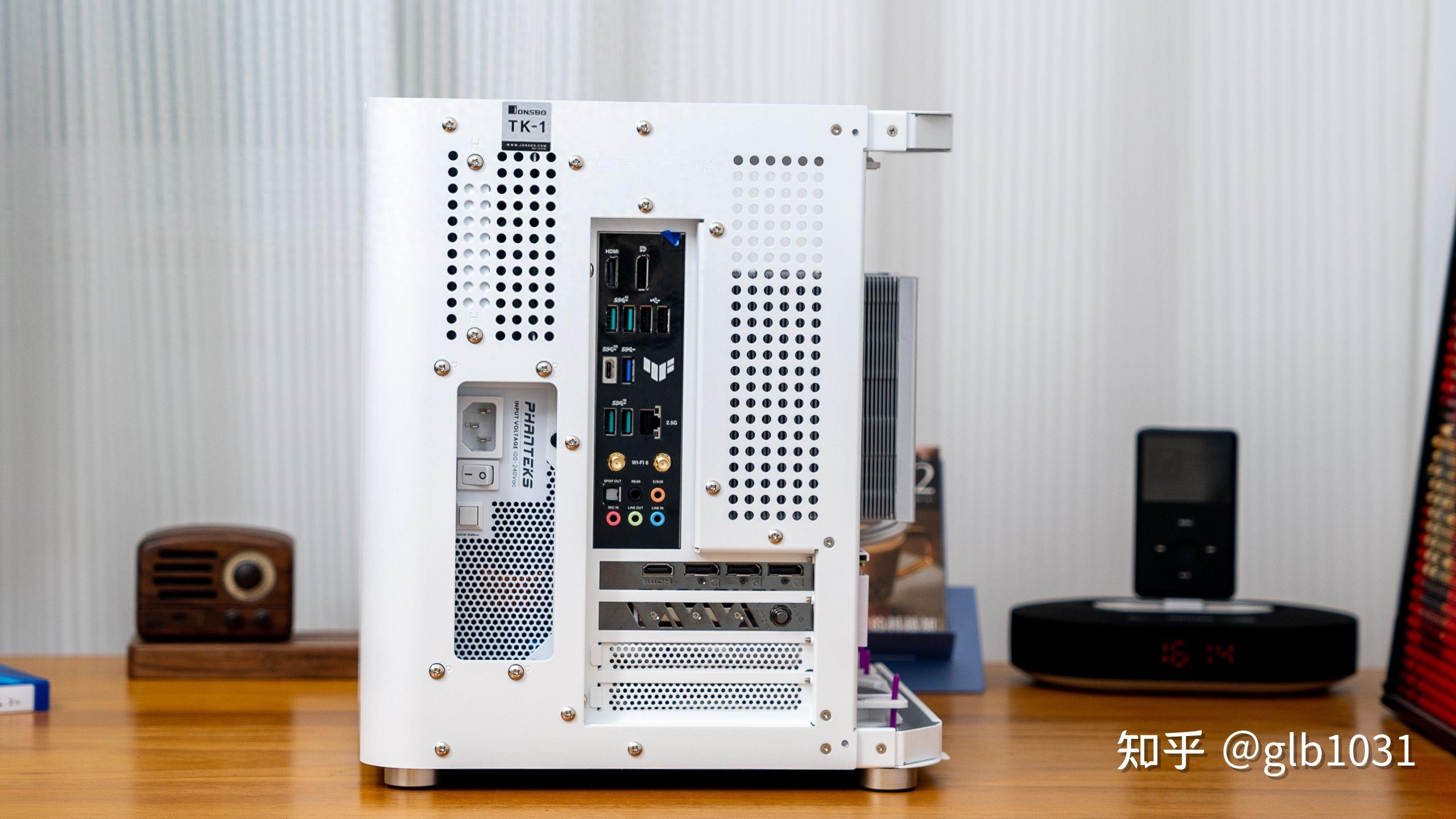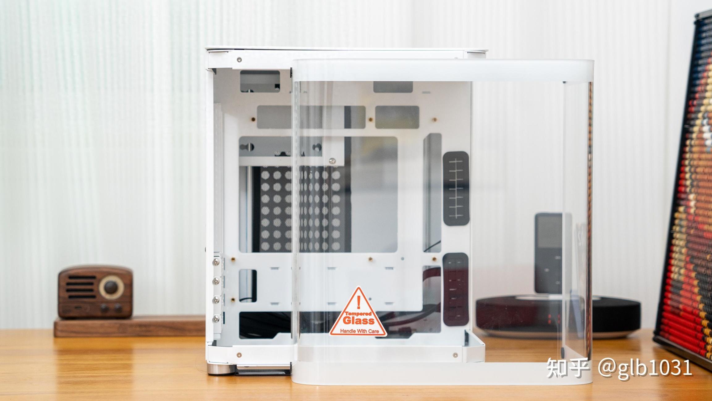 機箱方面是朋友自己選的,給了他幾個目前主流的選擇。像是沒有A柱的海景房、傳統海景房還有這次用的「魚缸式」的喬思伯TK-1 星艦艙白色海景房,朋友一眼就相中這款了。畢竟U型的雙曲面玻璃設計的機箱還是非常少見的,前後雙倉設計,也讓機箱整體尺寸僅一步縮小了不少。