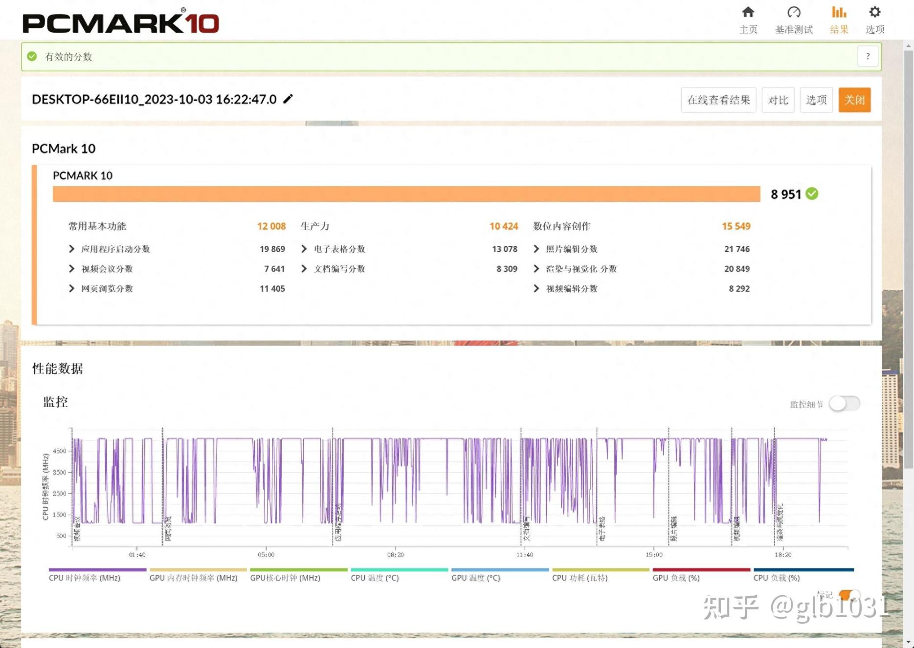 PCMark 10 測試總分8951,常用基本功能 12008,生產力 10424,數位內容創作 15549。