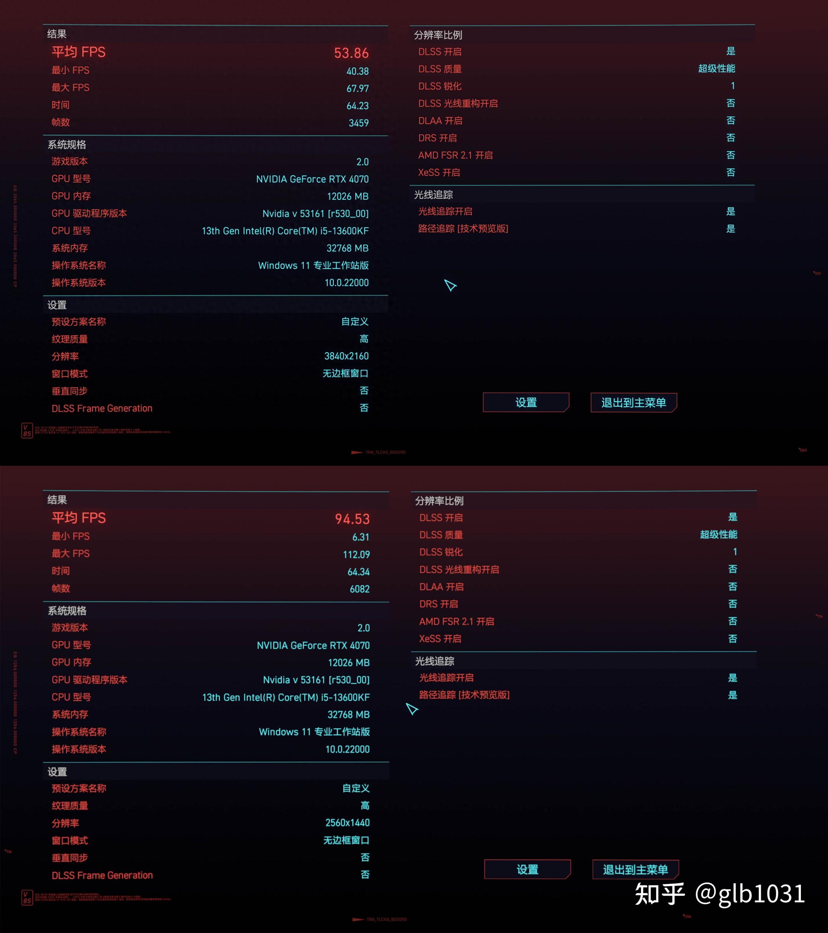 遊戲測試方面,「Cyberpunk 2077」4K 分辨率下開啓光追,DLSS 開啓後平均幀數 54幀,2K 分辨率下平均幀數95幀。