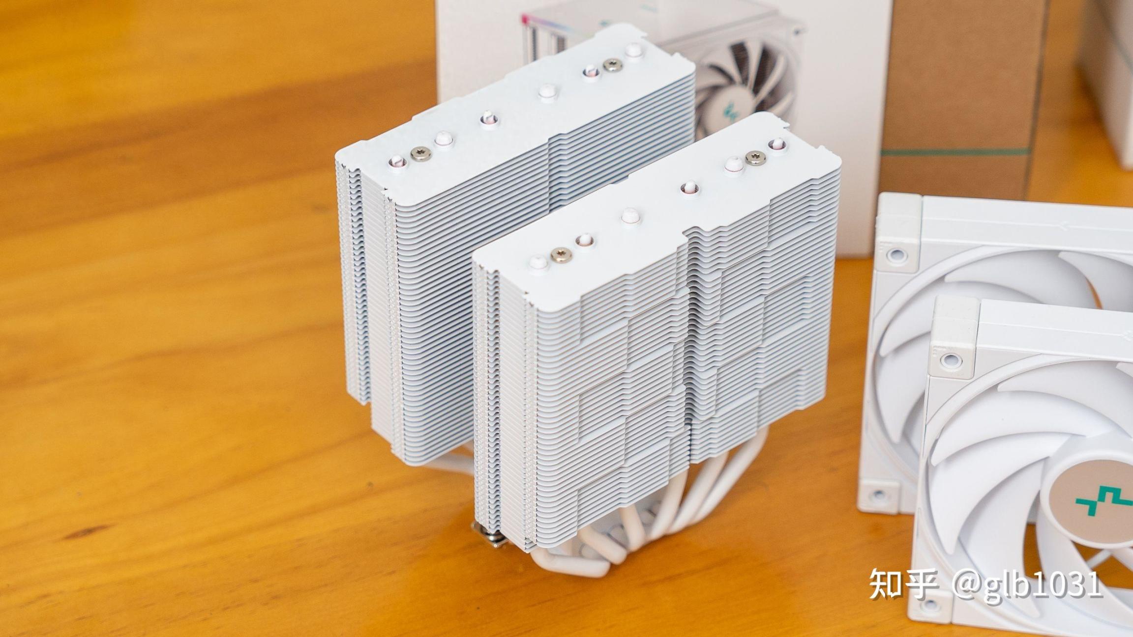 拆下頂蓋和風扇後可以看到內部的白色矩陣式鰭片組設計,在兩側內存部分也預留兼容馬甲條高度的開口,提供內存兼容性。
