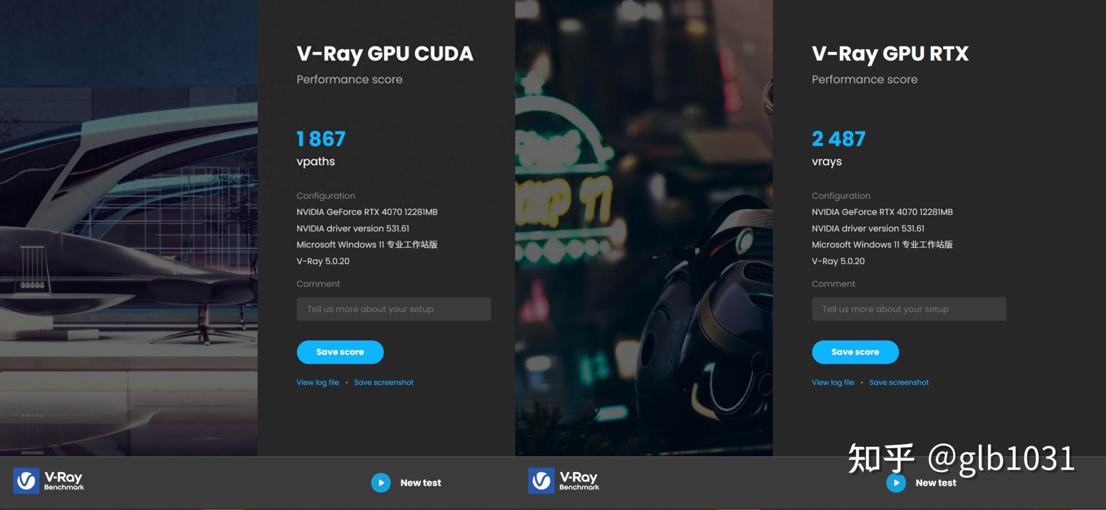 V-ray 測試成績如圖,RTX 4070 顯卡 V-ray GPU CUDA 1867、V-ray GPU RTX 2487。