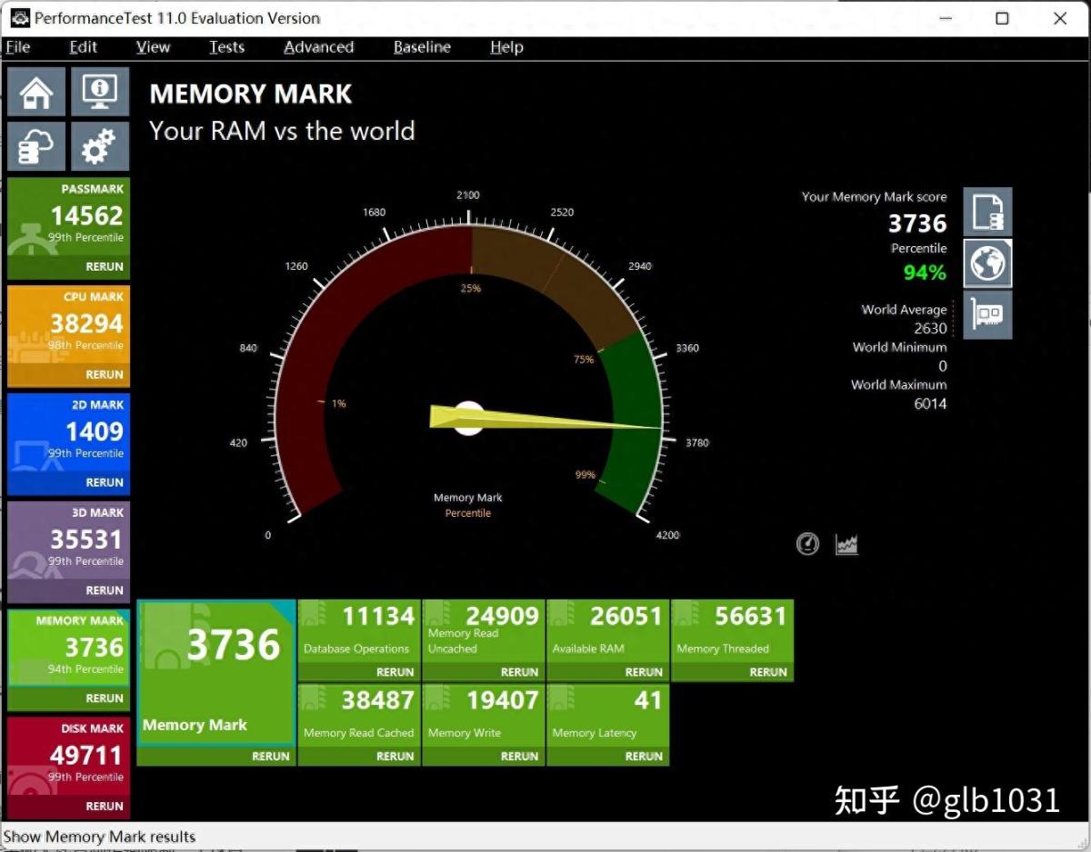 另外嘗試做了PerformanceTest 11.0 測試,通過測試可以看到內存得分3736 分。