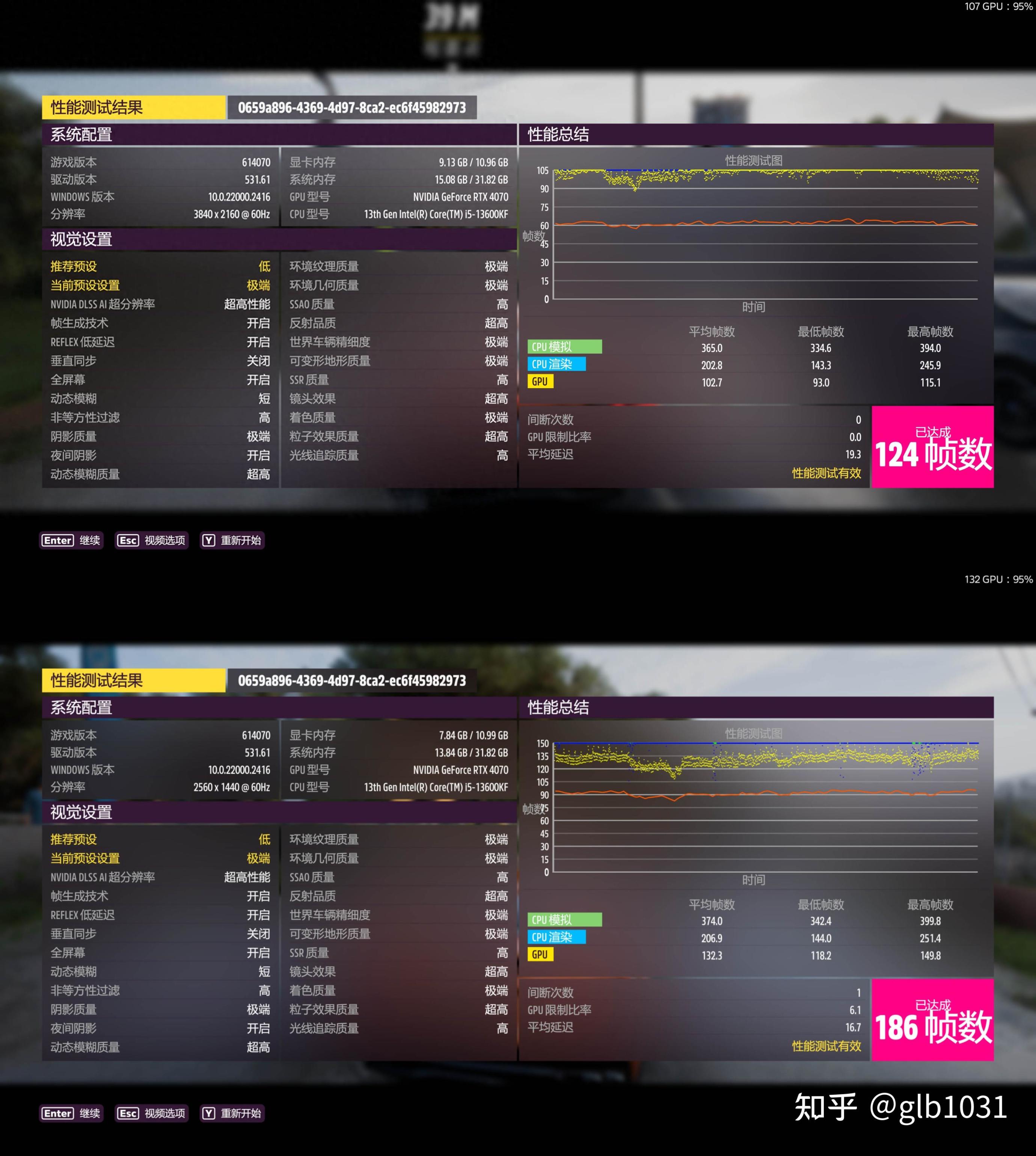 「FORZA HORIZON 5」4K 分辨率測試,平均幀數 124。2K 分辨率測試,平均幀數 186。