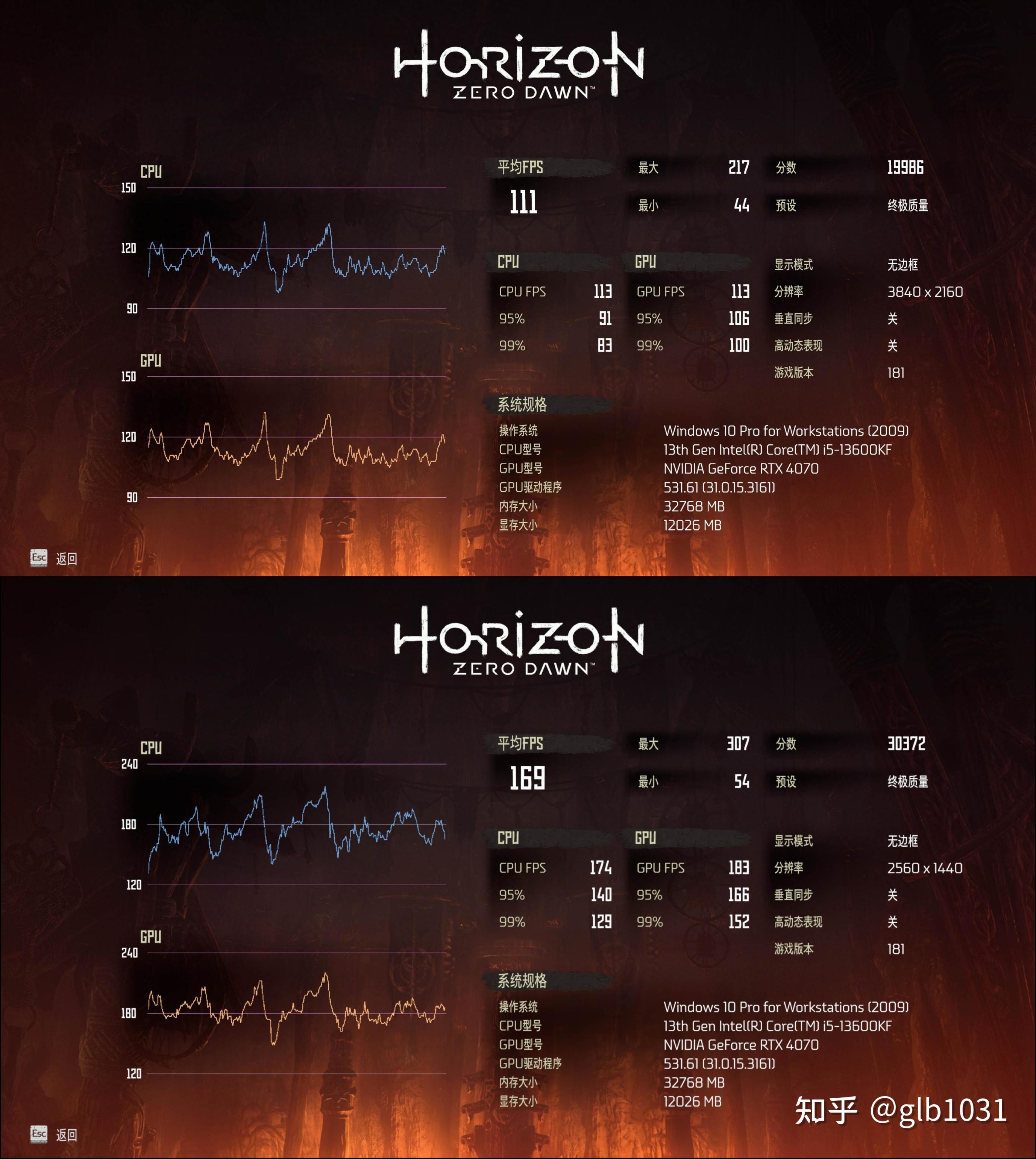「地平線 零之曙光」4K 分辨率測試,平均幀數 111。2K 分辨率測試,平均幀數 169。