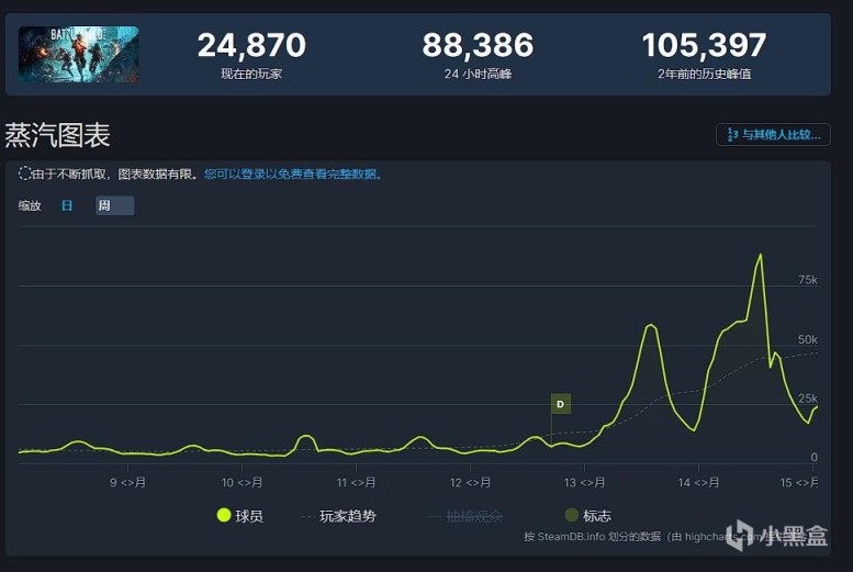 打折促销让游戏也迎来了新的在线高峰,根据 SteamDB 的数据显示,游戏的玩家在线峰达到了 8.8 万人,仅次于 2 年前的发售时的峰值 10.5 万人: