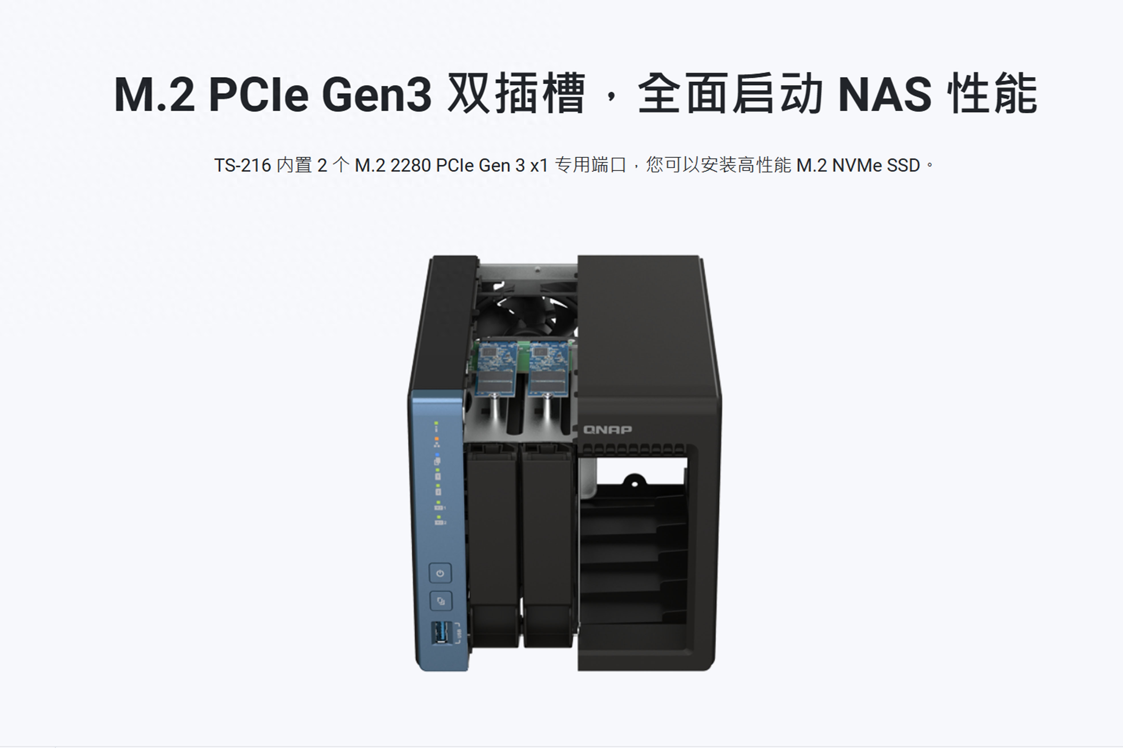 设备简介:威联通TS-216和常规双盘位设备有区别,原生为两个3.5寸机械硬盘+两个2280长度M.2槽的四盘位,虽然网口只有千兆看着有些无厘头,实际上高IOPS对数据整理有一定帮助,原因下面会说。