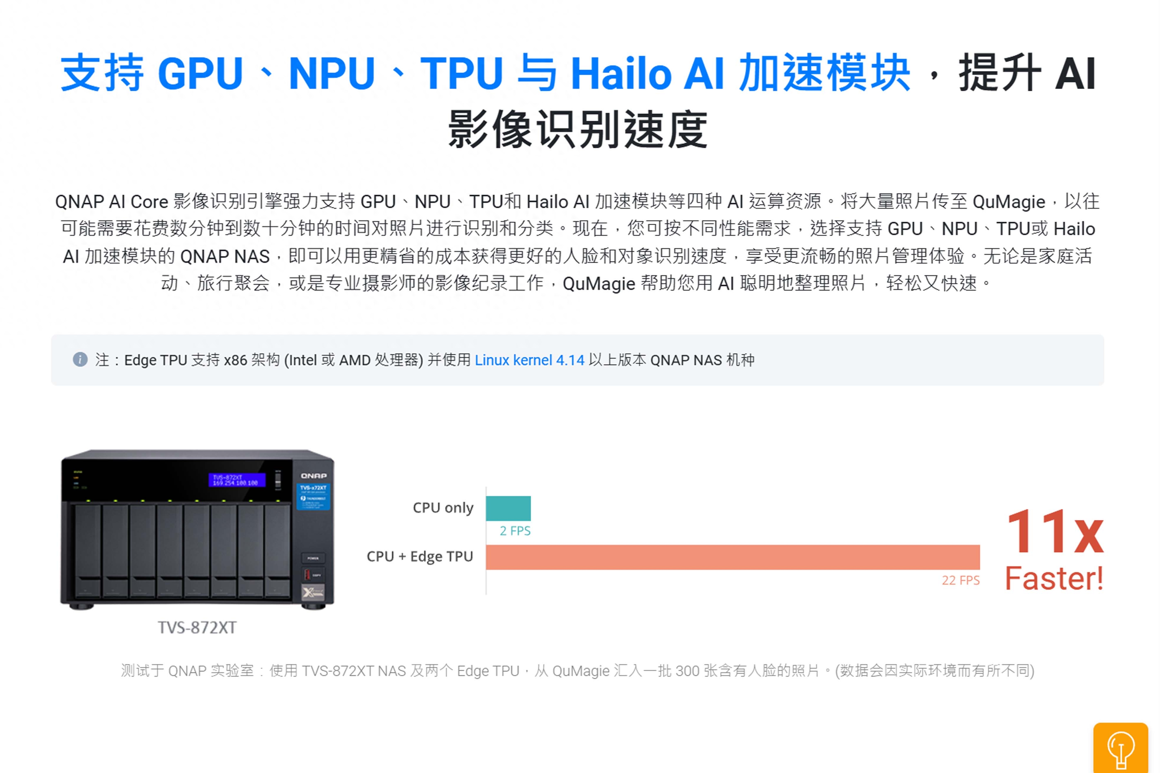 威联通TS-216处理器使用的是瑞芯微RK3568,该平台内置了1TOPS的NPU和G52架构的GPU,搭配上QuMagieAI相册和QVR监控这类威联通自研套件,可以在不怎么使用CPU本身的条件下轻松处理分类任务,这些吃随机读写性能的场景并不会浪费固态硬盘性能。