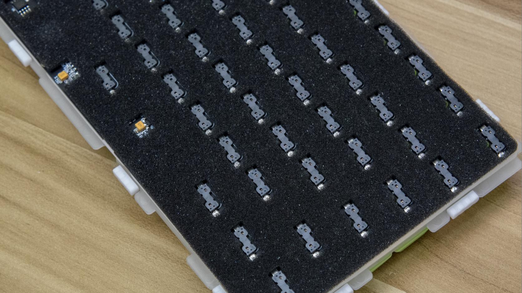 键盘采用板簧Gas结构,但由于内部填充过于饱满,导致键盘内胆形变空间有限,所以手感上并不那么软弹。