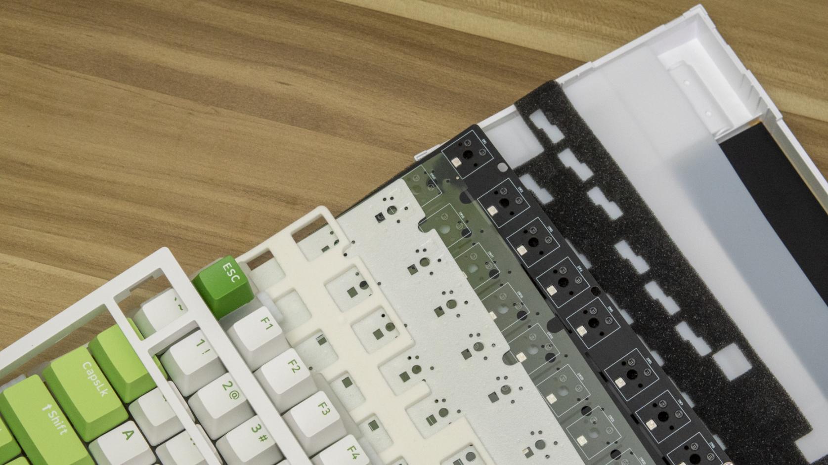 从手感上来说,这把键盘虽然用了PCB单键开槽+定位板单键开槽的双开槽设计,但由于75配列的整体尺寸和这把键盘的填充密度,AK820的内胆形变空间有限,所以这把键盘并不像其他单键开槽gas那样软弹,只能说是普通稍软Gas的弹度。说到gas结构,这个结构诞生原本是为了减少键盘内部在打字时和外壳的共振,所以黑爵这波不太软弹的Gas也属于是返璞归真了。