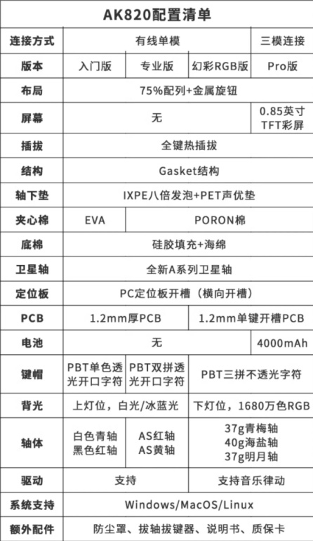 最后关于选购建议,AK820共4个版本,我最推荐的是有线连接的RGB幻彩版。三模连接的Pro版,1个是因为充电时会漏光,另一个是因为小屏幕本身的耗电,为了续航考虑,除非你对无线有着很强的需求,否则我并不是很推荐。