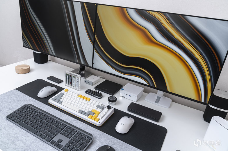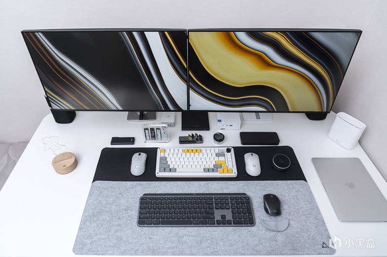 这个桌面环境是在去年做的整理升级,属于小幅度升级,在尽可能保证清爽简洁的基础上,将原来的32寸单显示器换成了双显示器,将桌面的itx主机+MBP的组合换成了华硕MINI小主机+MBP,升级了一下路由,色彩主题:黄、白、灰、黑配色,然后加入些许太空、外星人的元素进行搭配。(具体桌面清单附在结尾)