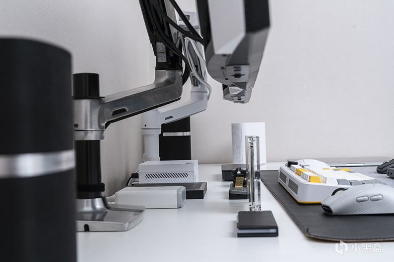 没有用原有的显示器支架,原装底座支架虽然很扎实,但是太占地方了,全部换成了爱格升的显示器支架,底部一下子就腾出了很多空间。至于为什么是一黑一白,因为黑色是之前升级换下来的,一直闲置了,这次刚好用上。