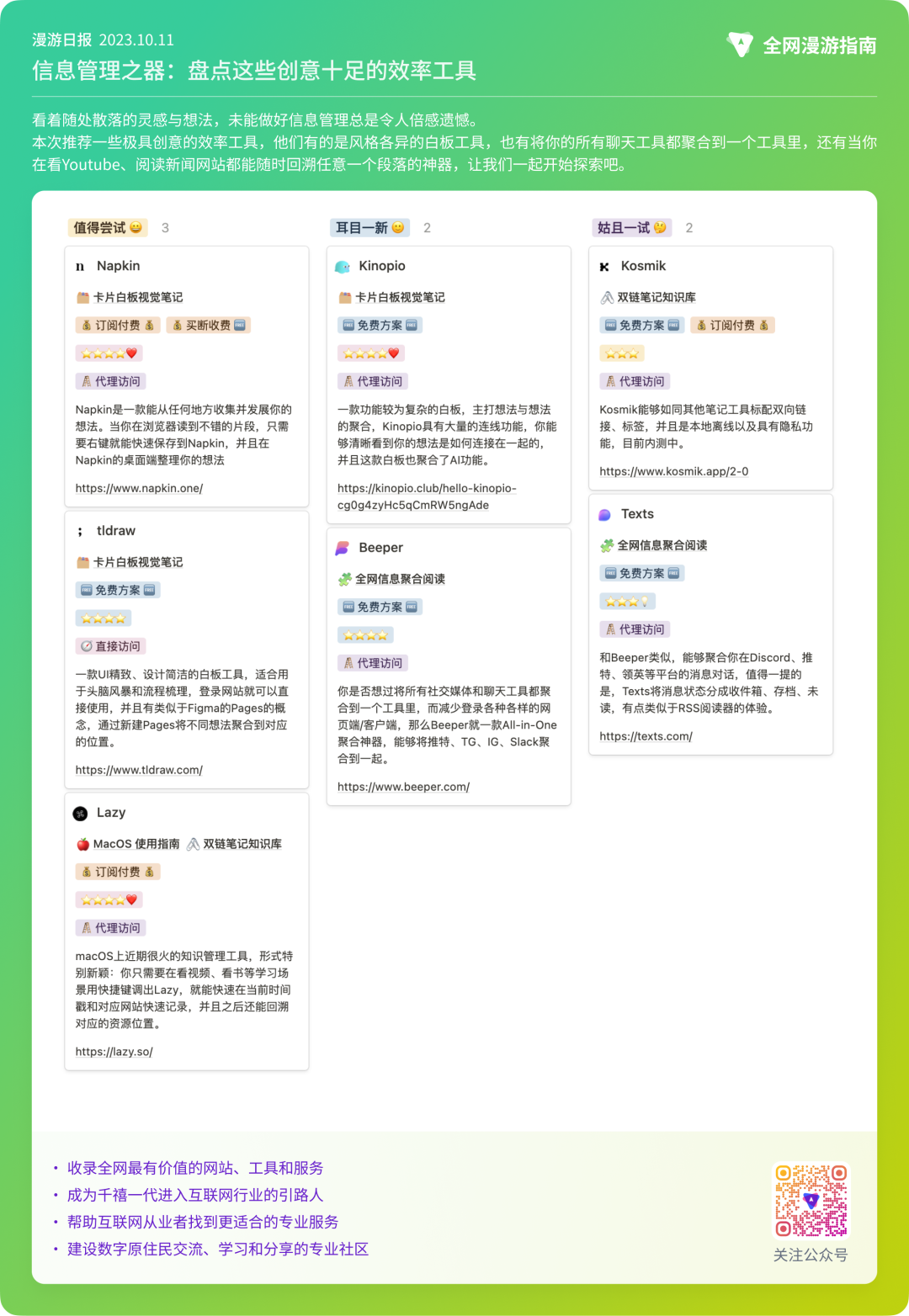 本次推薦一些極具創意的效率工具,他們有的是風格各異的白板工具,也有將你的所有聊天工具都聚合到一個工具裏,還有當你在看Youtube視頻、閱讀新聞網站都能隨時回溯任意一個段落的神器,讓我們一起開始探索吧。