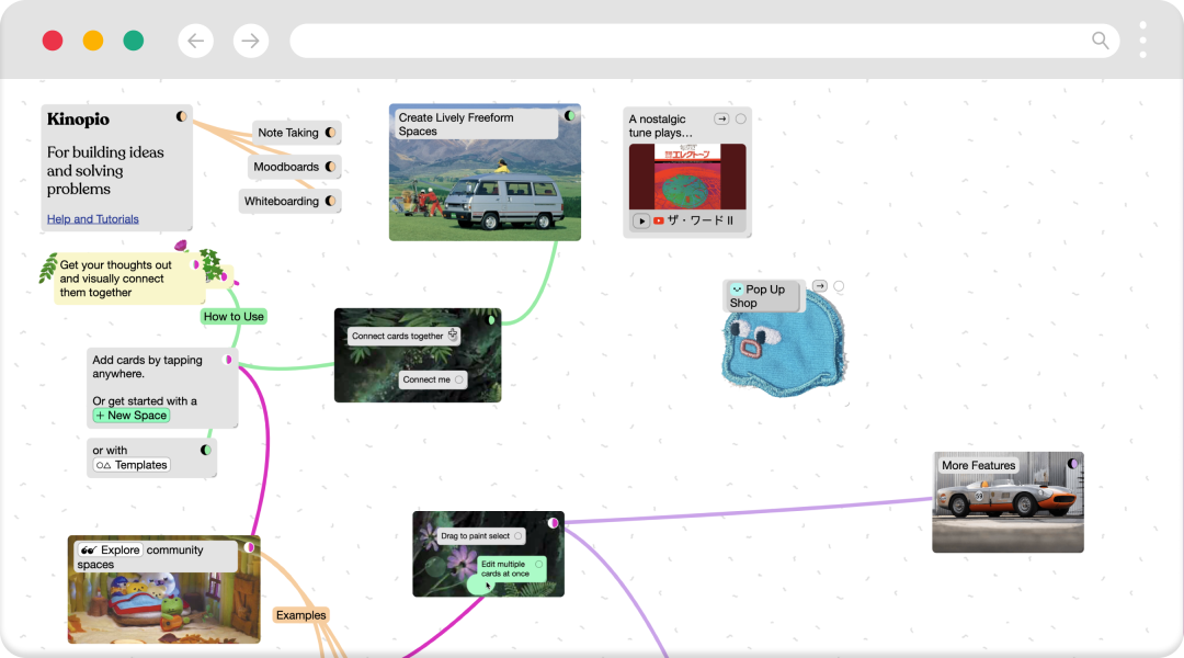 一款功能較爲複雜的白板,主打想法與想法的聚合,Kinopio具有大量的連線功能,你能夠清晰看到你的想法是如何連接在一起的,並且這款白板也聚合了AI功能。