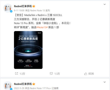 Redmi Note 13:9 月 11 日首次官方预热,9 月 21 日正式发布。