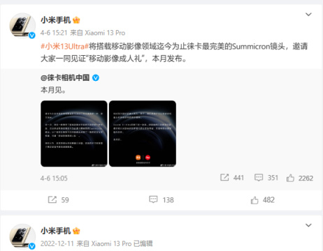 小米 13 Ultra:4 月 6 日徕卡官宣“与小米带来移动影像光学系统方案的进一步升级”,4 月 18 日正式发布。