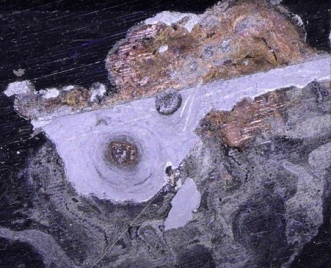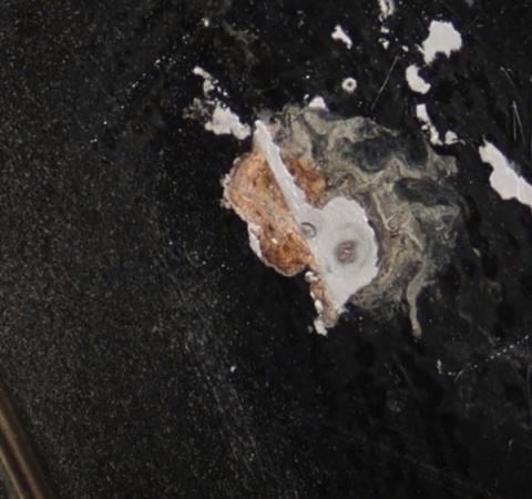 拆解后可以看到,RTX 3080散热器与GPU表面接触的原本明亮光滑的镀镍底座上,赫然出现了一个斑点,放大后清晰地显示这部分已经出现了腐蚀现象,触目惊心。