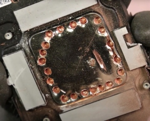 将散热底座钻孔拆开后,能看到部分铜材料已经出现了氧化,变成了蓝色,这块铜底已经变成了渣渣一样,扣掉它散热器就出现了个洞。
