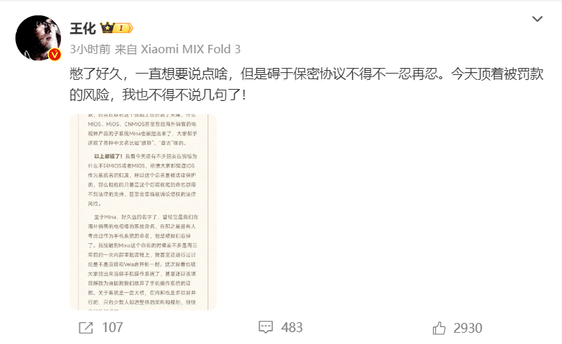 随着小米14冲上热搜,引起众多关注,关于小米即将发布的自研系统的传言也随之满天飞。今天,面对网络上的各种版本和猜测,小米公关负责人王化顶着被罚款的风险,进行了一次爆料。