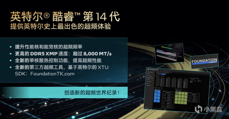 在硬件层面,第14代酷睿能够轻松支持超过8000MT/s的内存速度,提供单核散热控制功能。同时,英特尔XTU的SDK也开始开放给第三方提供更多的超频调整,FoundationTK就是其中的一款,这意味着酷睿系列的超频,除了主板调试、XTU之外,还多了更多的第三方选项。