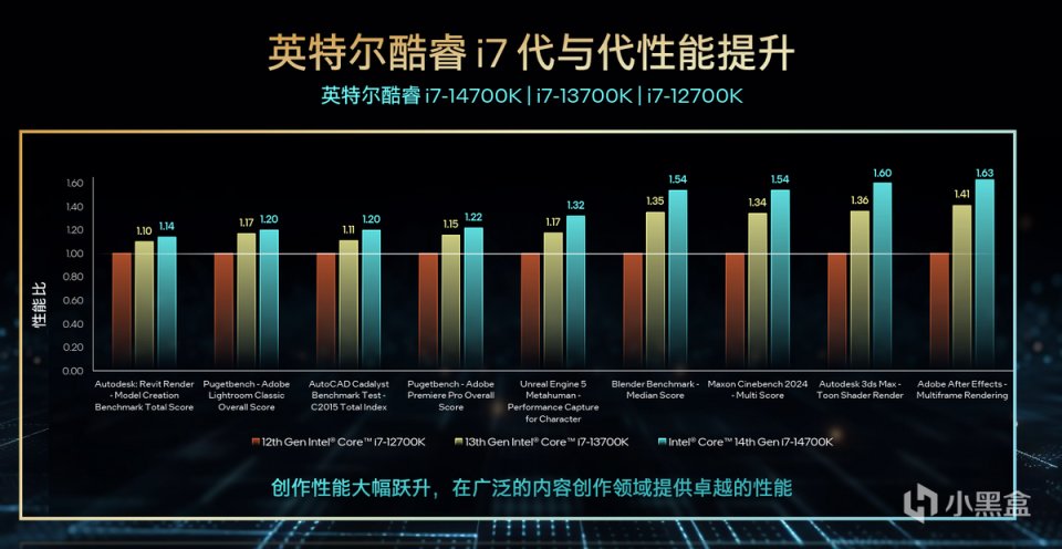 内容创作领域则无疑是酷睿的强项,凭借着多线程和专业软件的支持,酷睿i9-14900K与Ryzen 9 7950X对比全面占优。同时获得更多核心的酷睿i7-14700K表现比13700K和12700K有了质的变化,性价比更为突出。