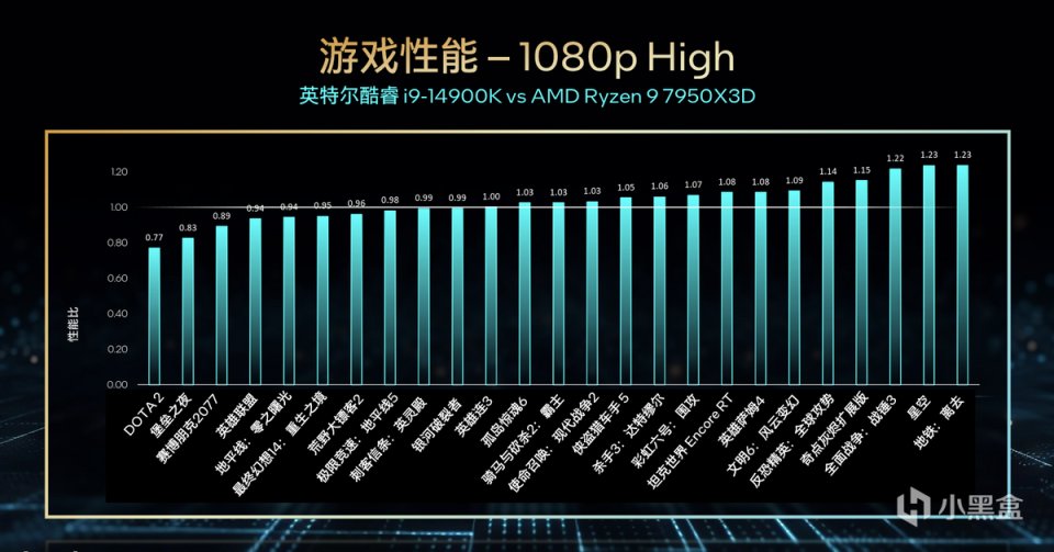 在媒体沟通会中,英特尔也强调了第14代酷睿在游戏和创作软件中的表现,例如酷睿i9-14900K对比Ryzen 9 7950X3D,大多数游戏场景性能比要更胜一筹。特别是在99%低帧率测试中,酷睿i9-14900K可以提供更好的体验。