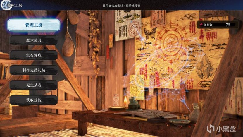 探索部分的内容很多,除了能撸猫撸狗,刷怪捡破烂以外,还有三个特殊NPC的【累计任务】以及每个地区的【城镇限定任务】,这一任务系统还是非常合理的,难度系数也适中。这里以击败敌人为例:前者可以将任意地区击败的敌人数量计入在内,而后者只能在当地完成,城镇限定完成所有任务之后可以去告示牌领取额外奖励,还是比较有成就感的。主角的住处叫做“长屋”,在长屋内主要可以通过简单的qte来完成“制作雕像”和“刀具保养”从而获取经验或经验增幅,在还有一个魔术工坊的部分,这个和能力武器强化以及道具制作有关,具体见下图。