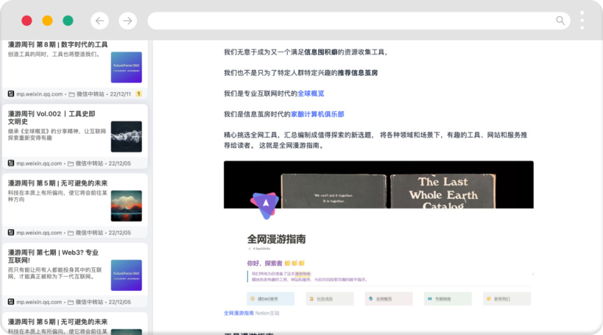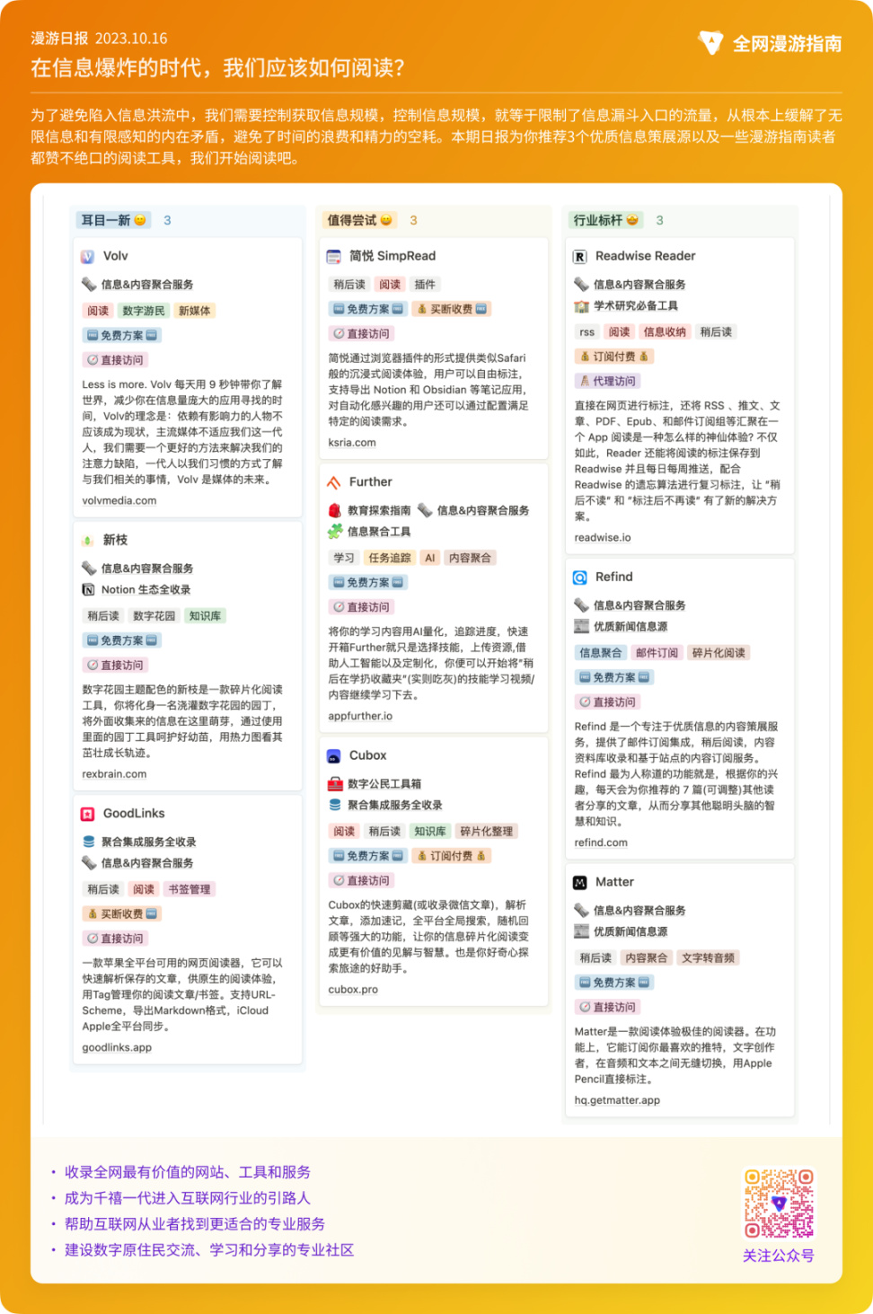 爲了避免陷入信息洪流中,我們需要控制獲取信息規模,控制信息規模,就等於限制了信息漏斗入口的流量,從根本上緩解了無限信息和有限感知的內在矛盾,避免了時間的浪費和精力的空耗。本期日報爲你推薦3個優質信息策展源以及一些漫遊指南讀者都讚不絕口的閱讀工具,我們開始閱讀吧。
